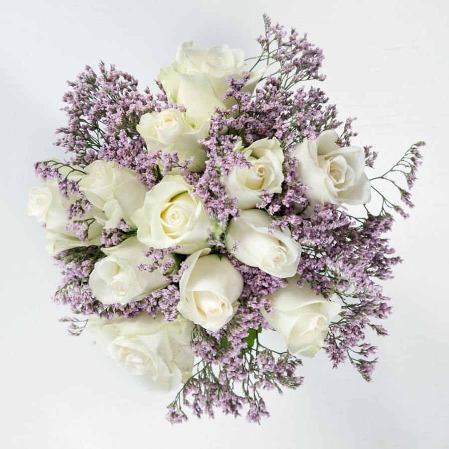 Embrace charm with our exquisite white roses, hand-selected for peak freshness. Combined with vibrant purple limonium, this bouquet showcases a unique and delightful design perfect for expressing heartfelt emotions.