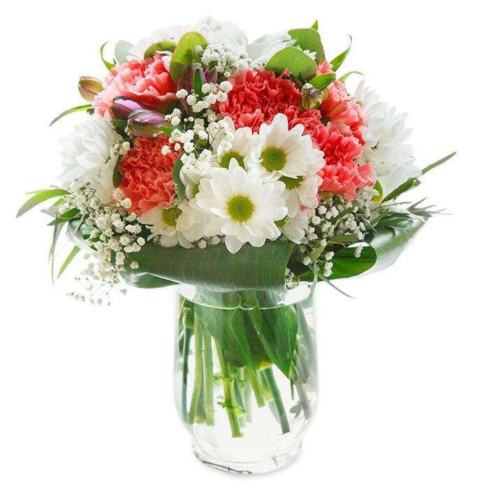 Enhance any occasion with our graceful flower arrangement, featuring a unique blend of snow-white chrysanthemums, delicate gypsophila, and soft pink carnations, all elegantly wrapped in lush aspidistra leaves.